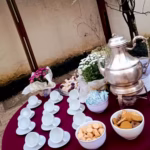 Mesa de Café na despedida com Samovar de Prata, xícaras de porcelana ou vidro e petit fours.